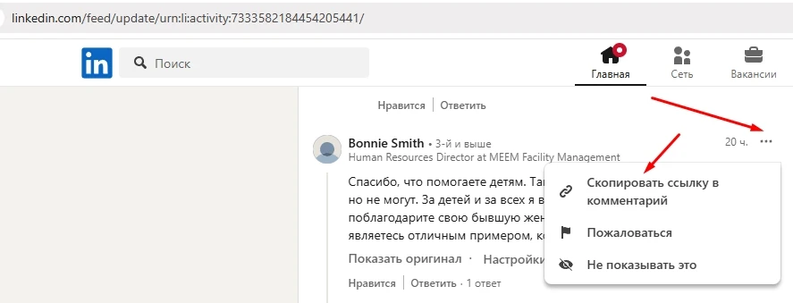Чтобы получить ссылку для кампании, нажмите справа на три точки, а затем кликните на «Скопировать ссылку на комментарий»