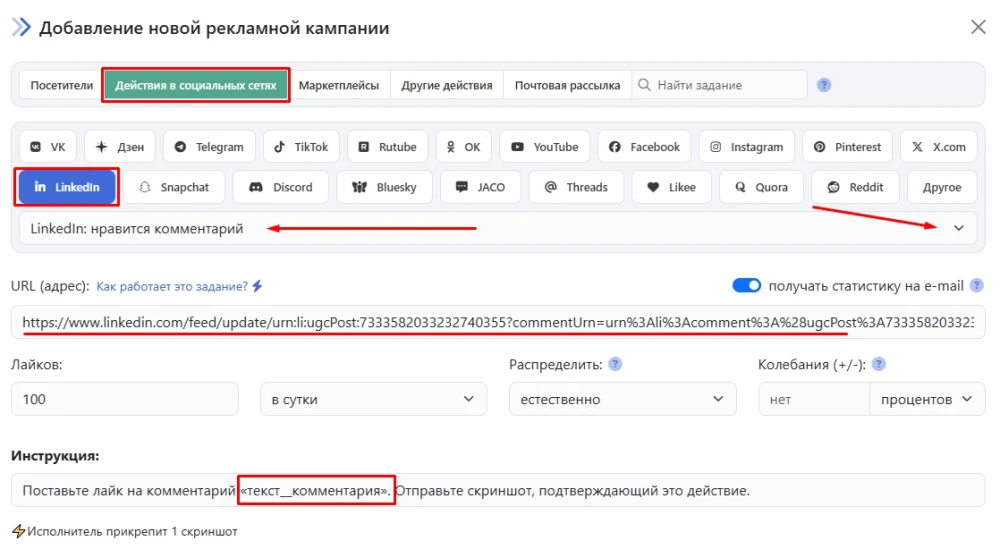 Введите ссылку на комментарий и количество лайков в нужный период. В поле «Инструкция» в части «текст__комментария» пропишите автора комментария или несколько первых слов, чтобы исполнители точно поставили лайк на тот комментарий, который вам нужен.