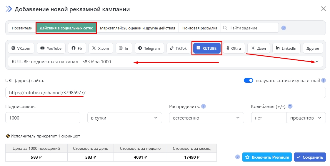 Зайдите в свой аккаунт на IPweb. В меню слева кликните «Продвижение» → «Мои кампании» → «Добавить рекламную кампанию» → «Действия в социальных сетях» → «RUTUBE» → «RUTUBE: подписаться на канал».