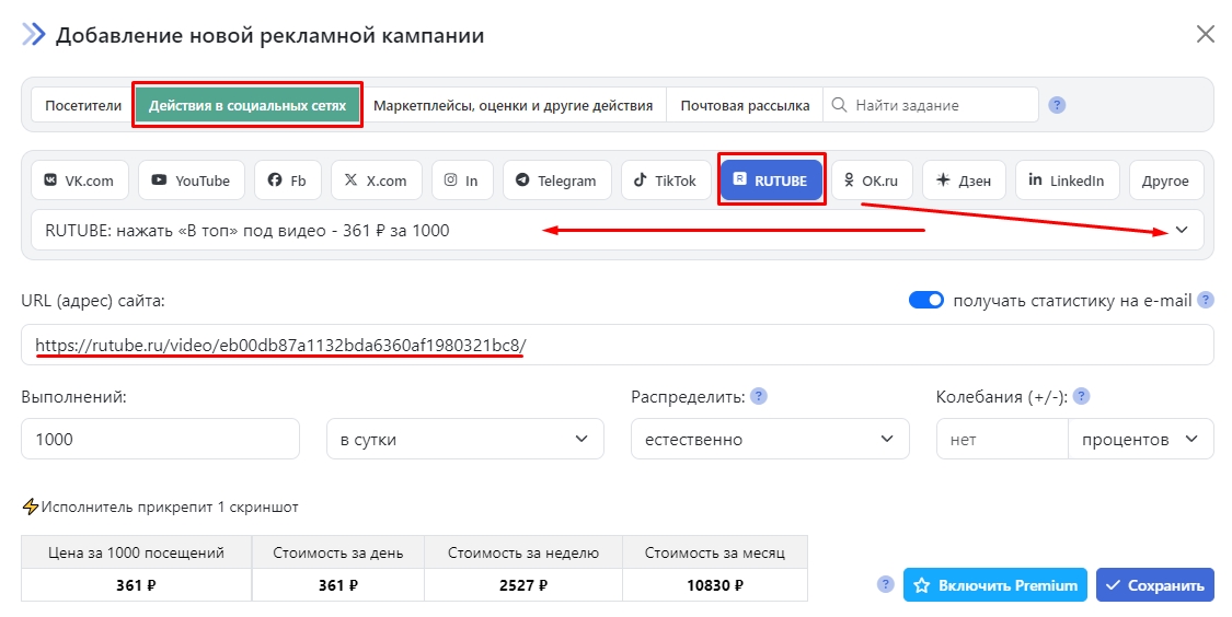 Зайдите в свой аккаунт на IPweb. В меню слева кликните «Продвижение» → «Мои кампании» → «Добавить рекламную кампанию» → «Действия в социальных сетях» → «RUTUBE» → «RUTUBE: нажать «В топ» под видео».