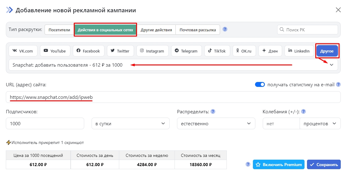 Зайдите в свой аккаунт на IPweb. В меню слева кликните «Продвижение» → «Мои кампании» → «Добавить рекламную кампанию» → «Действия в социальных сетях» → «Snapchat» → «Snapchat: добавить пользователя».