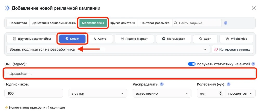 Для того чтобы создать рекламную кампанию, скопируйте ссылку на аккаунт разработчика Steam.