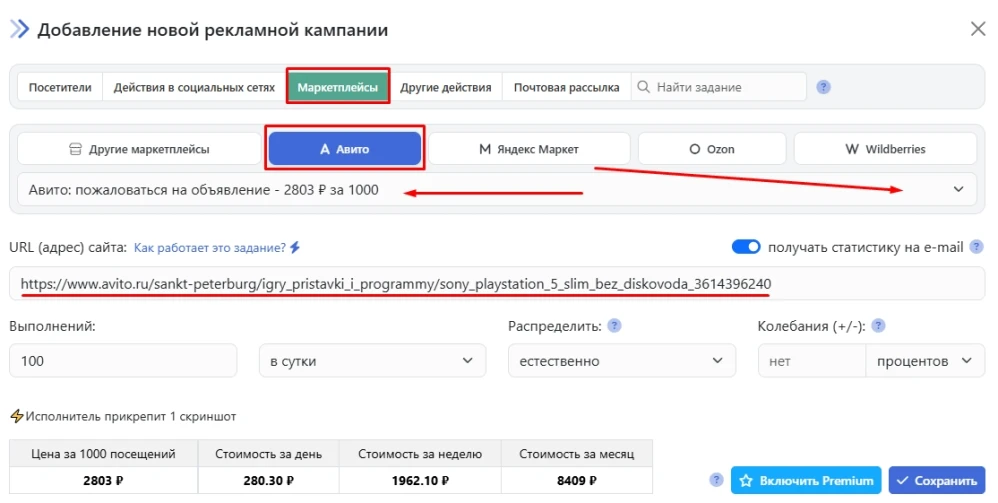 После того как ссылка получена, зайдите в свой аккаунт на IPweb. В меню слева кликните «Раскрутка» → «Ваши сайты» → «Добавить рекламную кампанию». Выберите тип раскрутки «Маркетплейсы» → «Авито» → «Авито: пожаловаться на объявление».