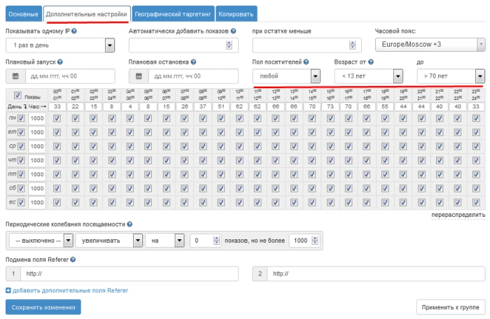 Обратите внимание, что при использовании демографического и географического таргетинга количество посетителей может заметно снижаться, так как будут отсеяны все, кто не попадет под указанные условия.