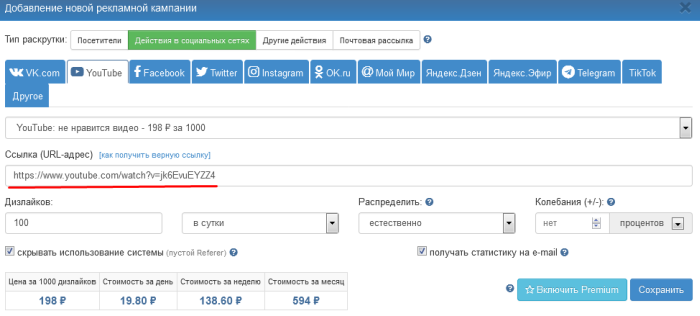 Введите ссылку на видео в YouTube и количество дизлайков в сутки. Выберете подходящую инструкцию и нажмите «Сохранить».