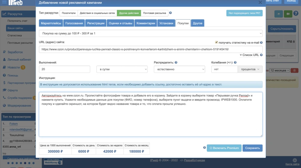 Чтобы создать такую рекламную кампанию, кликните на раздел «Раскрутка» — «Ваши сайты» в меню слева, нажмите кнопку «Добавить рекламную кампанию» в левом верхнем углу. Во вкладке «Другие действия» выберите тип продвижения «Покупки», в выпадающем списке вы можете выбрать подходящую вам сумму покупки от 0 до 500 рублей. Важно помнить, что в сумму покупки входит не только стоимость товара или услуги, но и все сервисные сборы, с которыми столкнется исполнитель при выполнении задания.