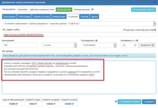 В круг задач данного типа заданий не входит установка мобильных приложений для операционных систем Android и iOS. В рамках этой рекламной кампании возможна загрузка, установка различного софта для персонального компьютера и регистрация пользователя на официальном сайте владельца программного обеспечения. Например, установка антивируса ESET Internet Security по реферальной ссылке (30-дневная пробная версия).