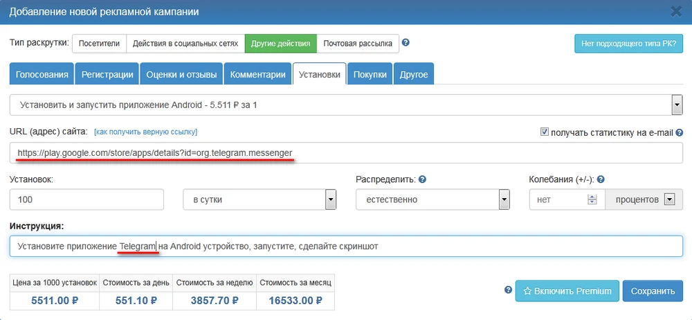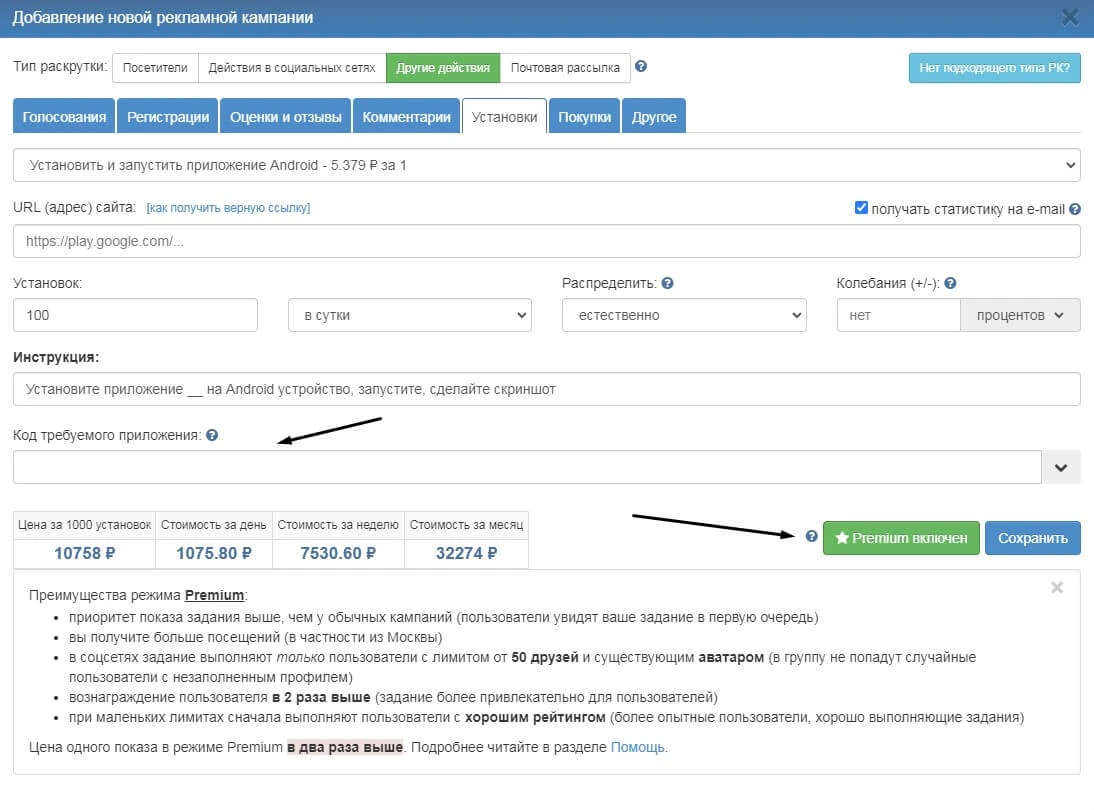 Если вы хотите, чтобы задание выполнялось в указанном вами приложении, тогда вам нужно указать его код в специальном одноимённом поле, которое становится доступным только после активации режима «Premium» в рекламной кампании.
