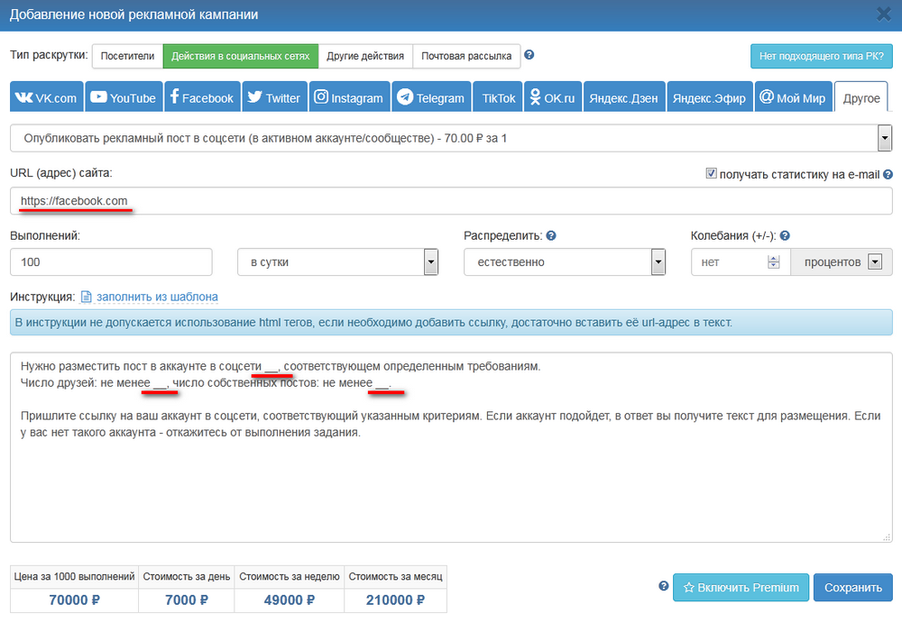 Зайдите в свой аккаунт на IPweb. В меню слева кликните «Продвижение» — «Мои кампании» — «Добавить рекламную кампанию» — «Действия в социальных сетях» — «Другое» — «Опубликовать рекламный пост в соцсети (в активном аккаунте/сообществе)»