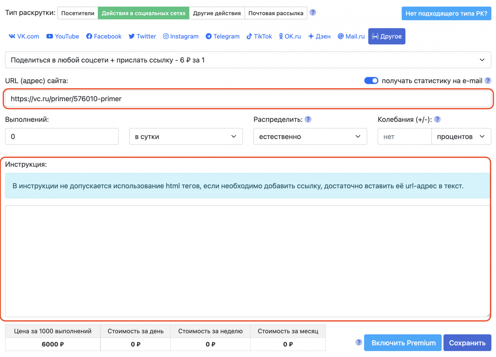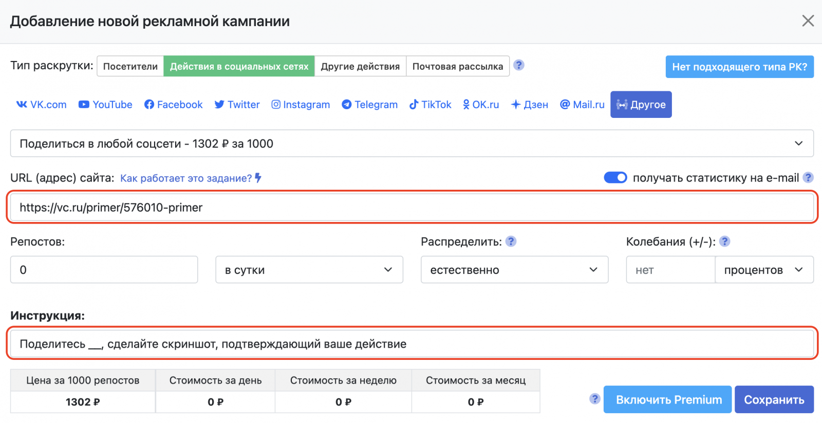 Если вы выбираете рекламную кампанию «Поделиться в любой соцсети + прислать ссылку», то не забудьте написать подробную инструкцию для исполнителей.