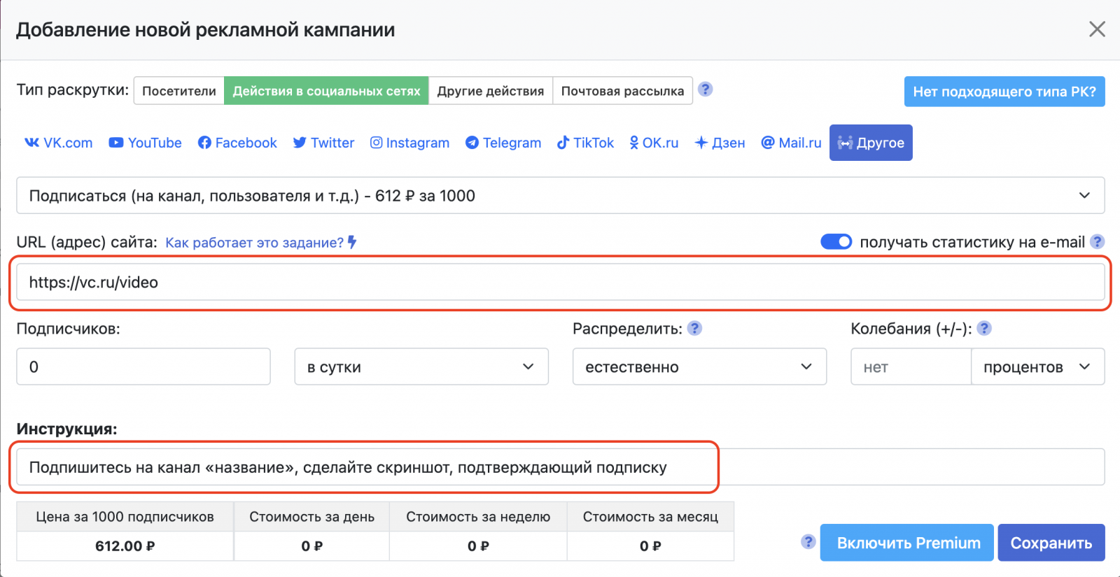 Если вы хотите увеличить количество подписчиков в социальной сети или другом интернет ресурсе, но эта соцсеть или интернет ресурс не входит в перечень социальных сетей, которые представлены на вкладке «Действия в социальных сетях» — воспользуйтесь рекламной кампанией «Подписаться (на канал, пользователя и т.д.)».