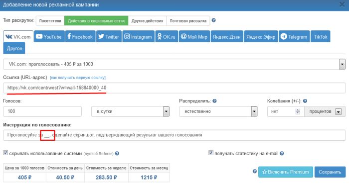 После этого вставьте ссылку на пост в соответствующее поле и измените описание, добавив как нужно проголосовать. Если вам нужна активность в голосовании — укажите «проголосовать за любой пункт» в инструкции.