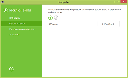После этого откройте раздел «Исключения», который находится с левой стороны окна настроек. Перейдите в раздел «Файлы и папки». Нажмите на кнопку «+», чтобы добавить в список исключений SpIDer Guard путь к программе IPweb Surf (т.е. место на диске, где она у вас установлена, например C:\Users\Виктор\AppData\Roaming\IPweb Surf\IPweb Surf.exe).