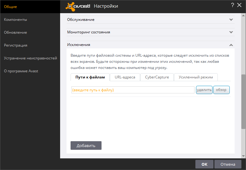Во вкладке Общие пролистайте чуть ниже, пока не увидите пункт Исключения. Разверните его.
