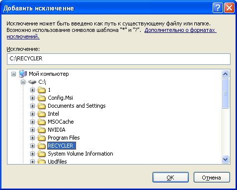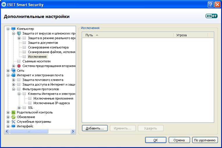 В дереве Дополнительных настроек выберите узел Компьютер - Защита от вирусов и шпионских программ, щелкните Исключения и нажмите кнопку Добавить.
