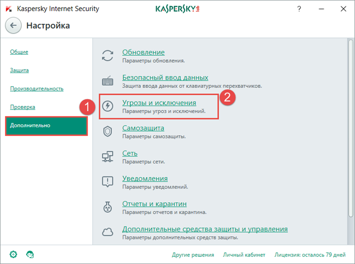 В окне Настройка перейдите в раздел Дополнительно и выберите Угрозы и исключения.