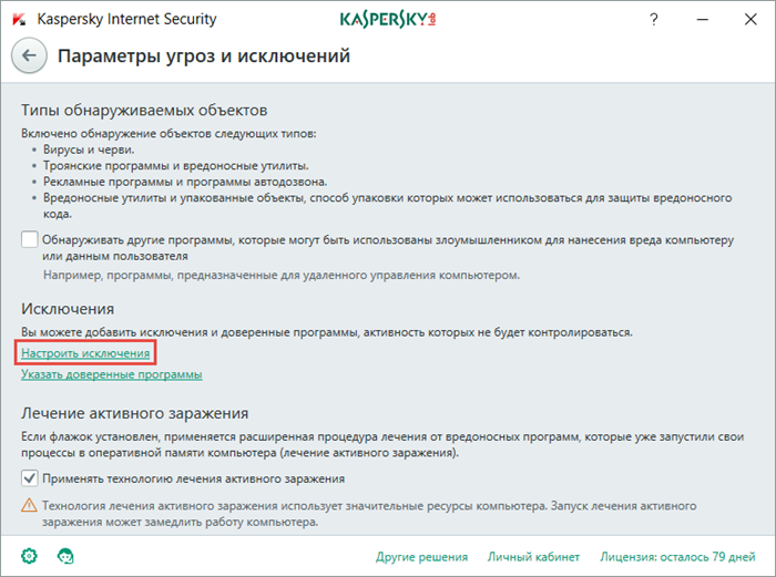 В окне Параметры угроз и исключений нажмите на ссылку Настроить исключения.