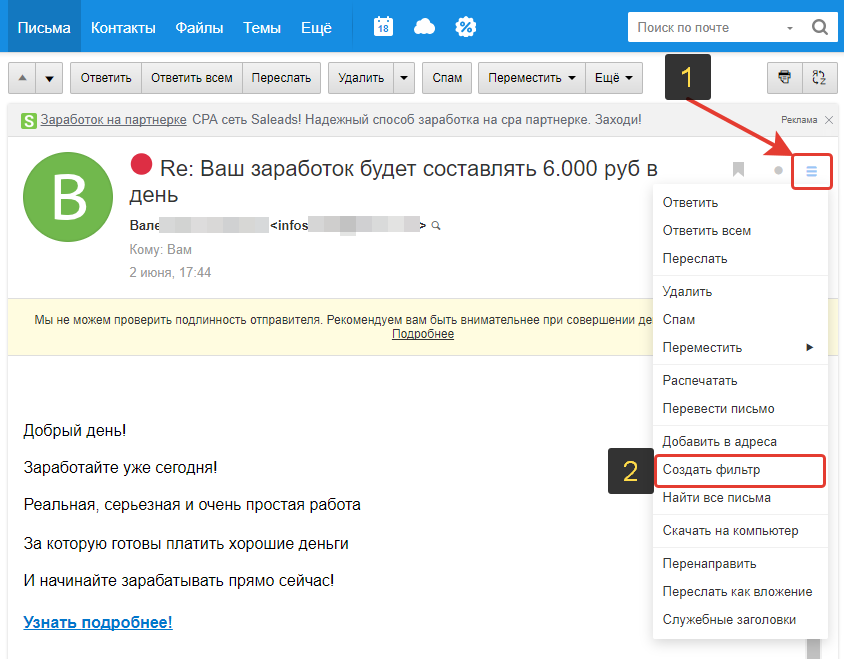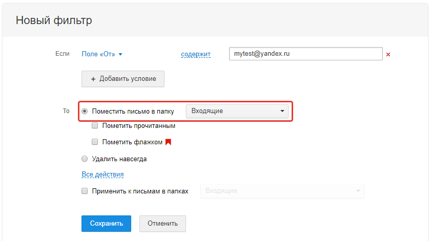 Шаг 3: Нажмите «Добавить фильтр». Затем в строку с условием «Если» – «поле От» – «содержит» вставьте адрес, с которого отправляются оплачиваемые письма – support@ipweb.ru. Затем выберите «То» – «Поместить в папку Входящие».
