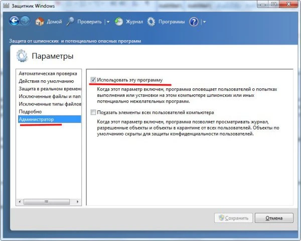 В открывшемся окне выберите Администратор в меню слева и снимите галочку с пункта "Использовать эту программу".
