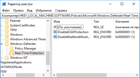 - В разделе Windows Defender выберите подраздел Real-Time Protection (или создайте его), а в нем создайте параметры с именами DisableIOAVProtection и DisableRealtimeMonitoring