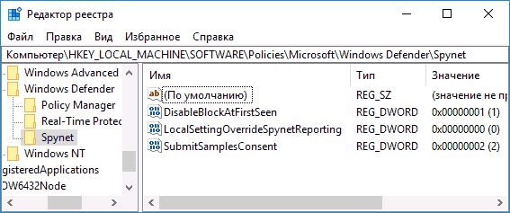 - В разделе Windows Defender создайте подраздел Spynet, в нем создайте параметры DWORD32 с именами DisableBlockAtFirstSeen (значение 1), LocalSettingOverrideSpynetReporting (значение 0), SubmitSamplesConsent (значение 2). Это действие отключает проверку в облаке и блокировку неизвестных программ.