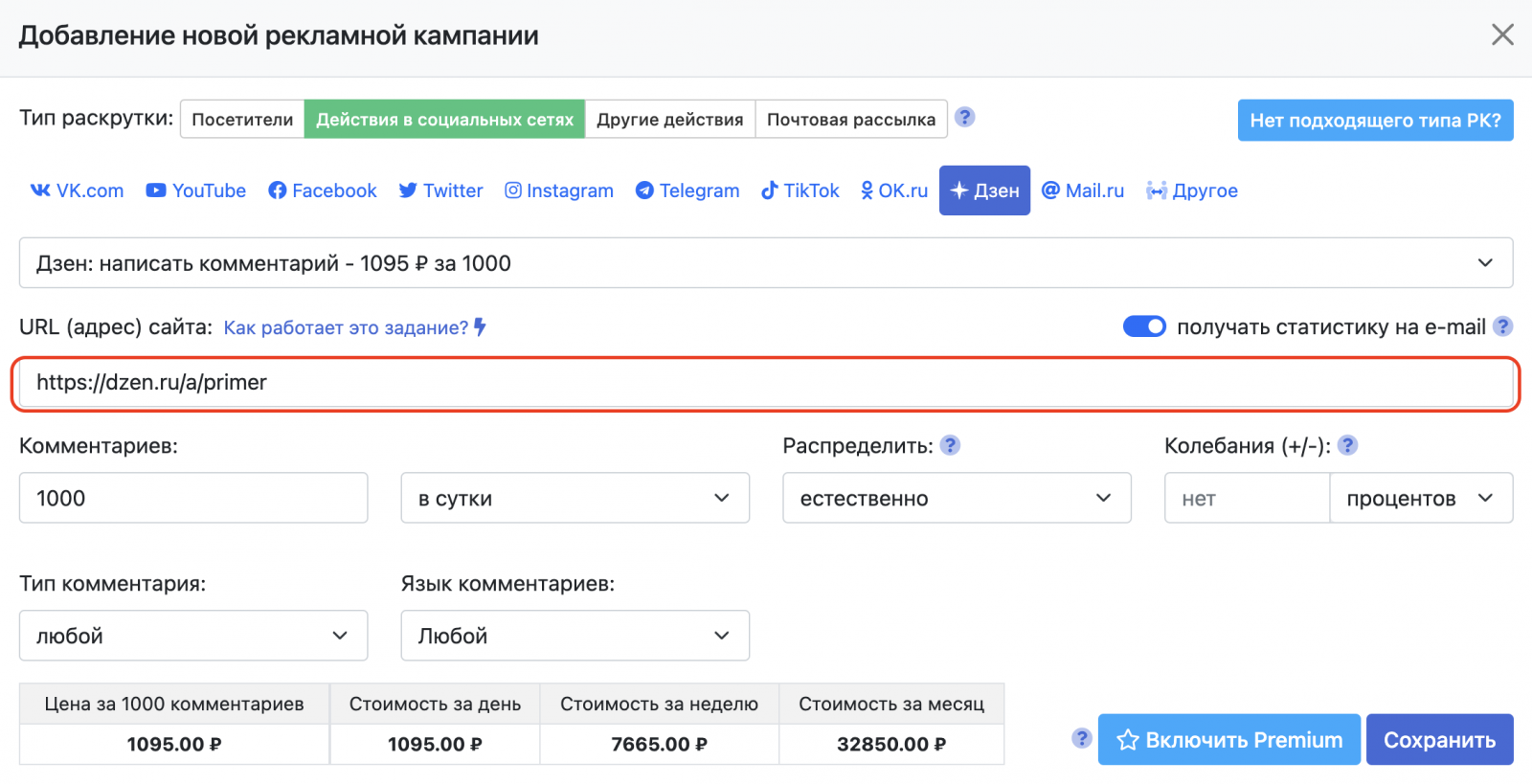 Введите ссылку на публикацию в Дзен и количество комментариев в сутки.