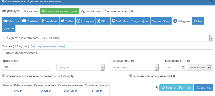 Зайдите в свой аккаунт на IPweb. В меню слева кликните «Продвижение» — «Мои кампании» — «Добавить рекламную кампанию» — «Действия в социальных сетях» — «Telegram» — «Telegram: прочитать пост».