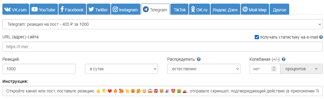 В рамках этой рекламной кампании можно заказать реакции под постом на канале или под сообщением в групповом чате.