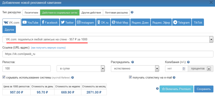 Зайдите в свой аккаунт на IPweb. В меню слева кликните «Продвижение» — «Мои кампании» — «Добавить рекламную кампанию» — «Действия в социальных сетях» — «VK» — «VK.com: поделиться любой записью на стене».