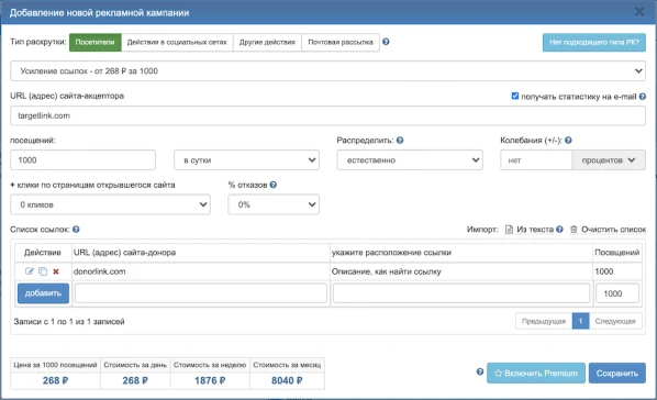 В меню слева, кликните «Раскрутка» — «Ваши сайты» — «Посетители» — «SEO» — «Усиление ссылок». Укажите расположение или название ссылки на сайте-доноре, количество переходов по ней и количество дополнительных кликов на сайте.