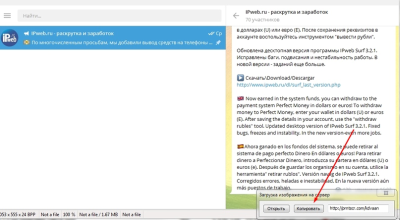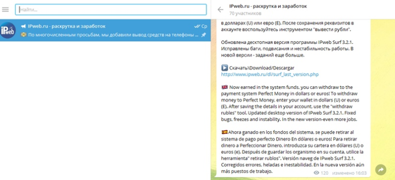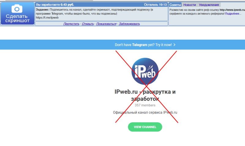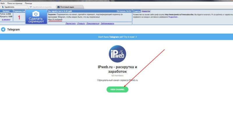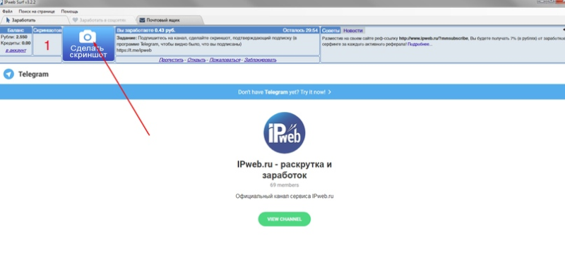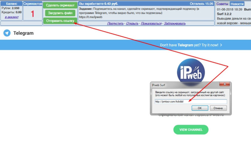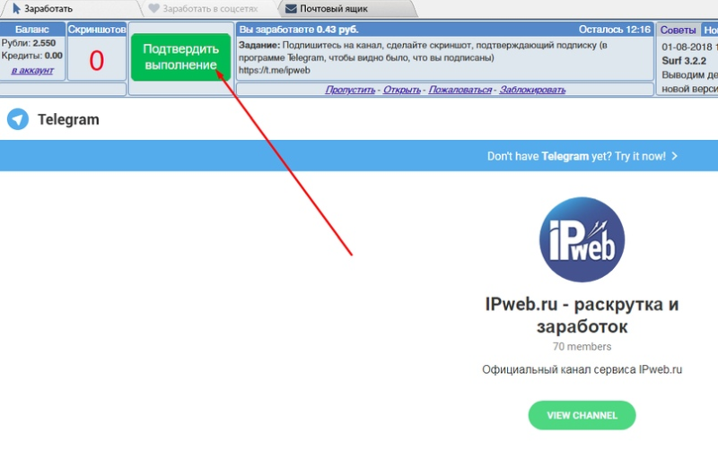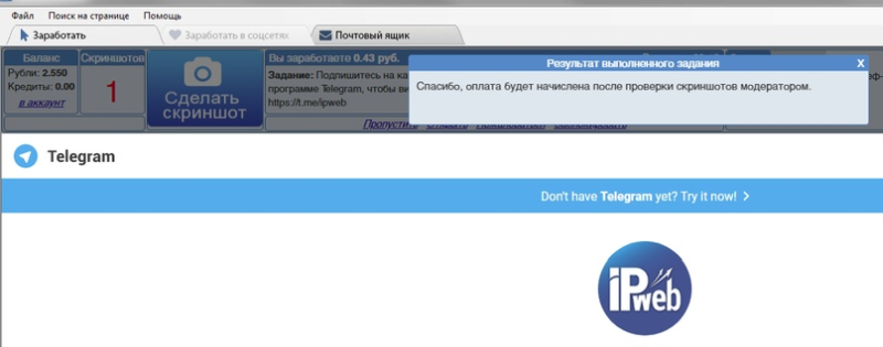 При получении скриншотной версии задания в декстопной программе IPweb Surf Телеграм-клиент открывается сам на канале, где необходимы действия. В мобильном приложении для перехода в Телеграм необходимо нажать зеленую кнопку "Начать".