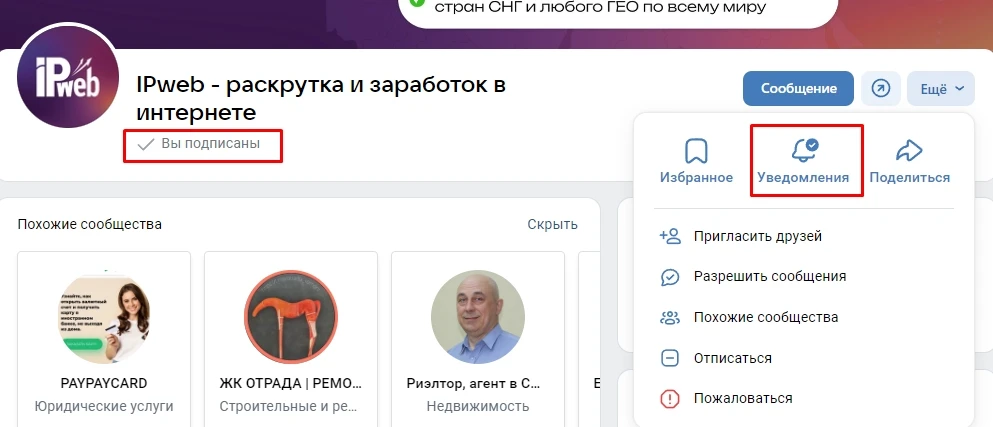В таком задании вам нужно подписаться на группу Вконтакте и на уведомления о её новых публикациях. На открывшейся странице нажмите кнопку «Подписаться». Затем разверните меню «Ещё» и нажмите на колокольчик (в мобильном приложении колокольчик находится в правом верхнем углу и также под кнопкой «⋮»).