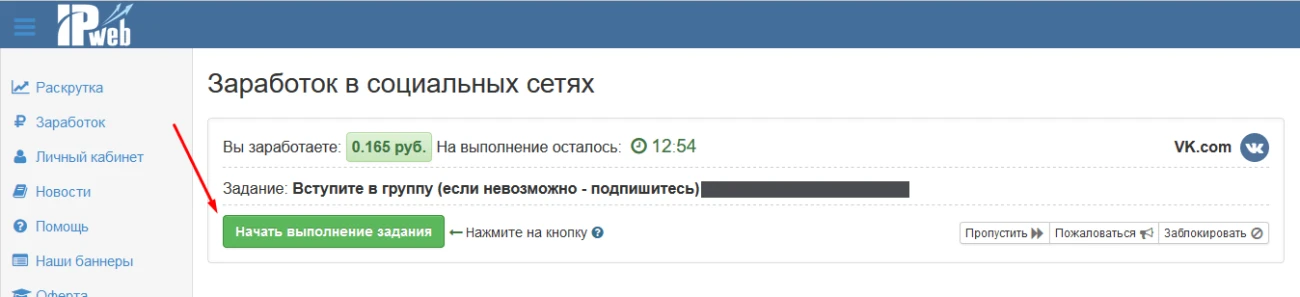 Это функционал сервиса IPweb.ru, который поможет пользователям больше зарабатывать, а рекламодателям – более комплексно продвигать свои проекты. Если вы хотите начать зарабатывать в социальных сетях, то обязательно привяжите свои аккаунты к IPweb (это можно сделать в личном кабинете). Обратите внимание, что задания из тех соцсетей, аккаунты которых вы не привязали, вы получать не будете. Поэтому при заработке в соцсетях чем больше аккаунтов вы привяжете, тем лучше. ВКонтакте – самая популярная социальная сеть на территории нашей страны, поэтому заработок внутри нее многих интересует в первую очередь. Поэтому на данной странице мы будем рассматривать заработок ВКонтакте и задания, связанные с ним. Опишем порядок выполнения задания в социальных сетях. Когда вам попадется такое задание, вы увидите следующий интерфейс: