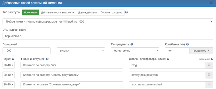 В этой рекламной кампании вы можете сами настроить любые клики по вашему сайту (с проверкой по шаблону) – до 10 кликов по любым ссылкам/баннерам.