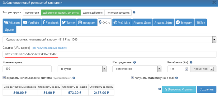 Чтобы заказать рекламную кампанию, скопируйте ссылку на публикацию в Одноклассниках из браузера.