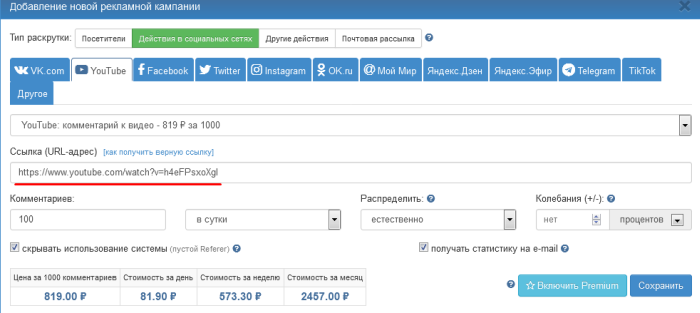 Чтобы добавить рекламную кампанию, скопируйте ссылку на вашу видеозапись или YouTube канал.