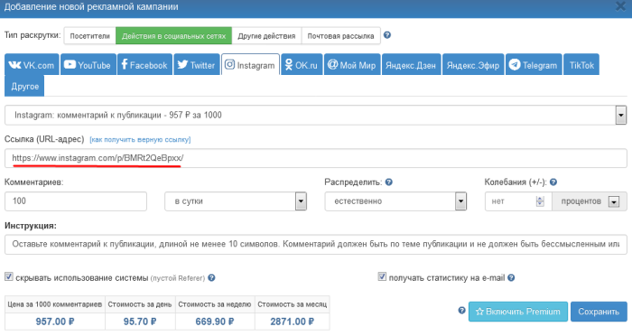Введите ссылку на публикацию и нужное вам количество комментариев в сутки. Выберете подходящую инструкцию из предложенных вариантов.