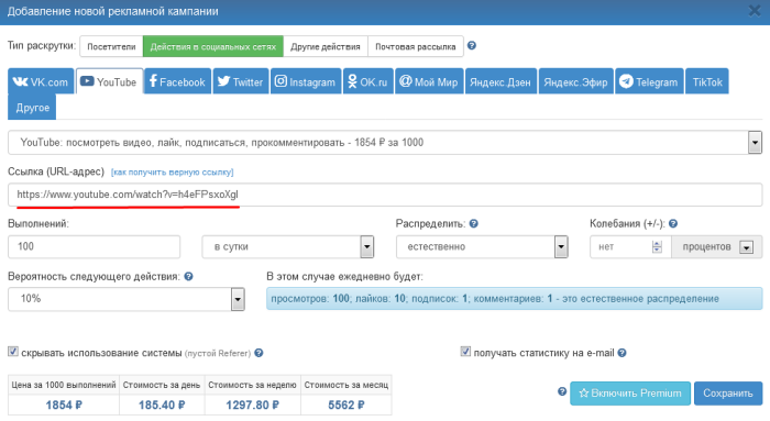 Введите ссылку на видео в YouTube и количество выполнений в сутки. При необходимости выберете подходящую инструкцию.
