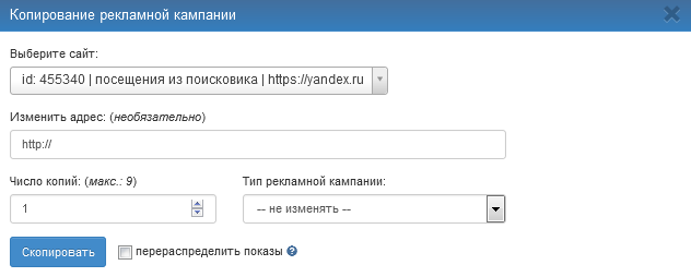 Функция копирования рекламной кампании полезна в случаях, когда вам необходимо создать несколько кампаний со схожими настройками, или вы хотите изменить адрес раскручиваемого сайта, не меняя его настроек. Для копирования рекламной кампании перейдите по кнопке "Копировать кампанию" с главной страницы управления кампаниями (пункт меню - "Ваши сайты"):