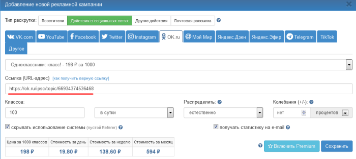 Зайдите в свой аккаунт на IPweb. В меню слева кликните «Продвижение» — «Мои кампании» — «Добавить рекламную кампанию» — «Действия в социальных сетях» — «OK» — «Одноклассники: Класс!».