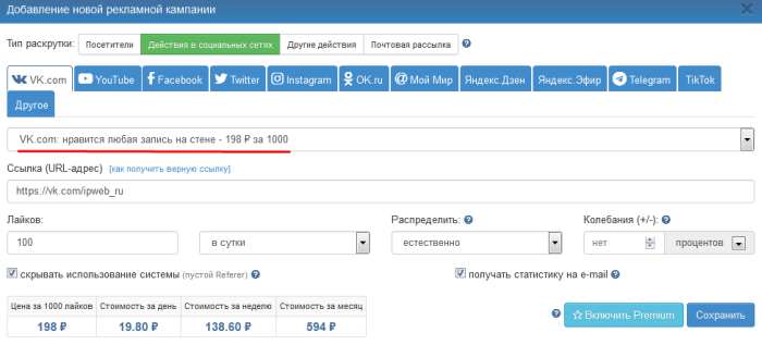 Зайдите в свой аккаунт на IPweb. В меню слева кликните «Продвижение» — «Мои кампании» — «Добавить рекламную кампанию» — «Действия в социальных сетях» — «VK» — «VK.com: нравится любая запись на стене».