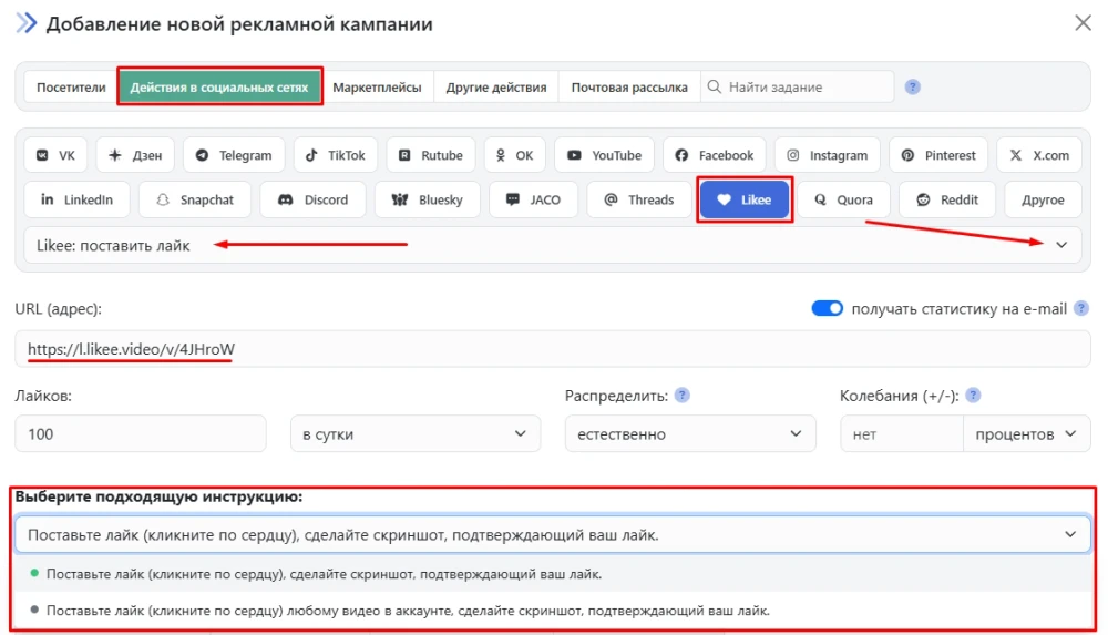 Введите ссылку на видео или аккаунт, количество лайков в нужный период, выберите подходящую инструкцию из выпадающего списка и нажмите кнопку «Сохранить». Кампания сразу отправится на модерацию и будет запущена после прохождения проверки.