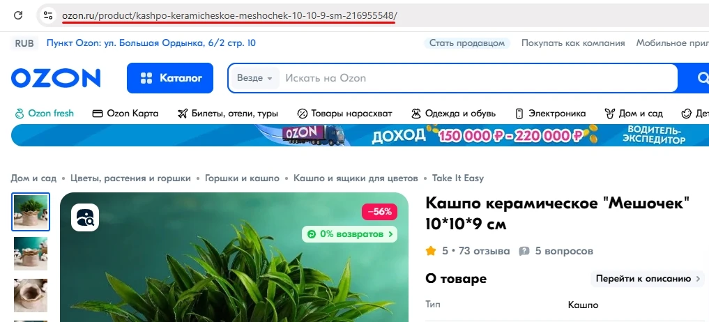 Для того чтобы создать рекламную кампанию, скопируйте ссылку на ваш товар в адресной строке браузера. Мы рекомендуем при добавлении ссылки на Ozon удалять UTM ссылки. Так ссылки будут короче. Кроме того, трудно предусмотреть как наличие UTM ссылки повлияет на показатели статистических алгоритмов сервиса.