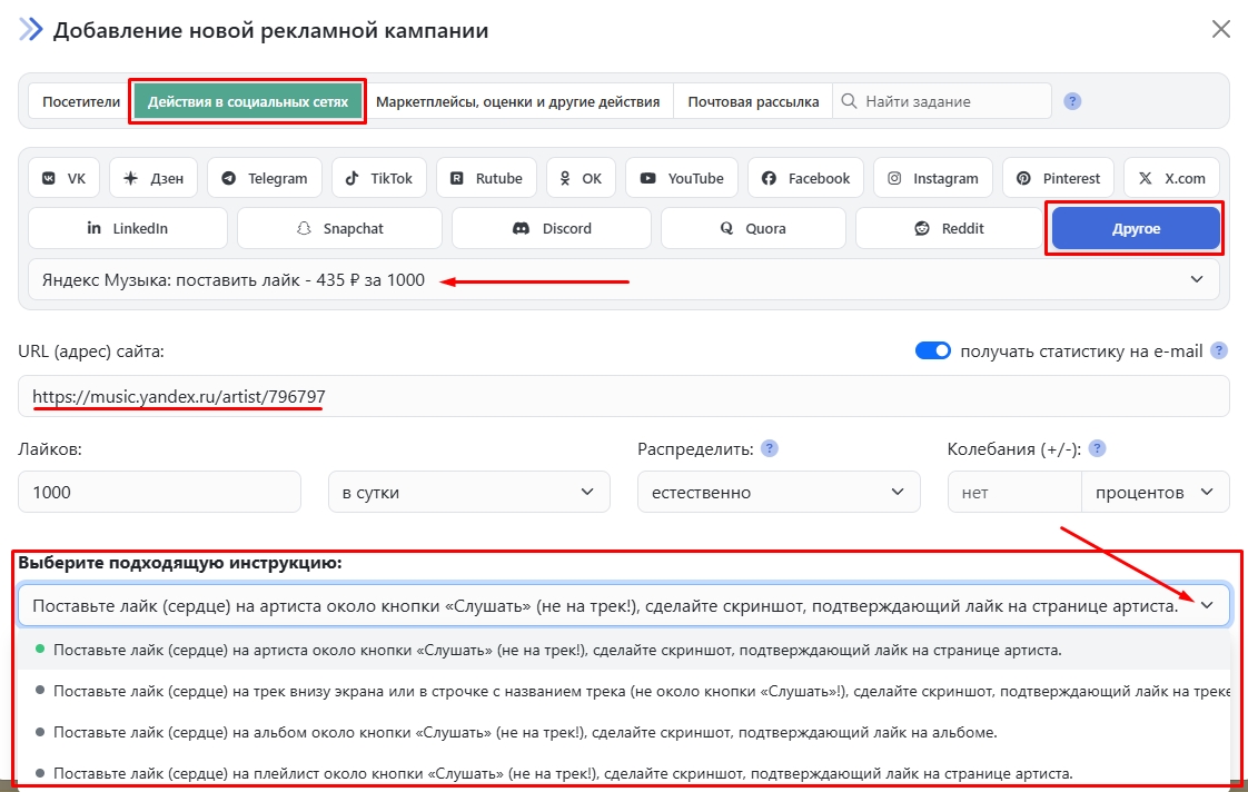 Введите ссылку на артиста/трек/альбом/плейлист, количество лайков в нужный период времени, выберите подходящую инструкцию из выпадающего списка и нажмите кнопку «Сохранить». Кампания сразу отправится на модерацию и будет запущена после прохождения проверки.