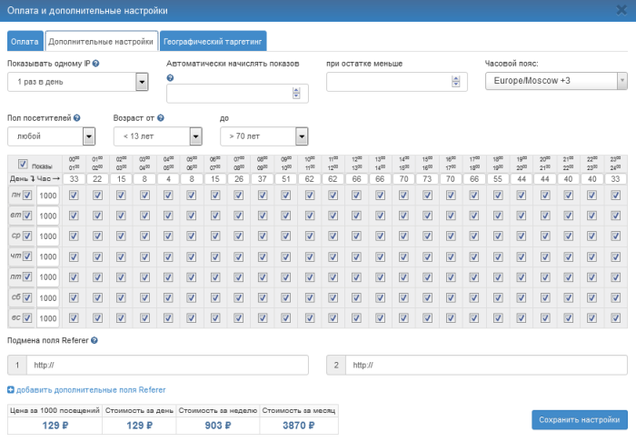 Во вкладке дополнительные настройки, можете более точно настроить показ кампании, указав сколько раз показывать ваш сайт одному IP, указывается в поле "Показывать одному IP", так же можете установить автоматическое начисление средств для показа кампании "Автоматически начислять показов", "если на счете останется меньше ", показы начисляются 1 раз в час при условии уменьшения баланса сайта ниже установленного порога, и вам необходимо будет только вовремя пополнять основной счет аккаунта, а распределение средств по счетам сайтов будет происходить автоматически. В дополнительных настройках, вы можете настроить часовые и дневные лимиты, пол посетителей и возраст, а также число посещений сайта в сутки с одного IP-адреса.