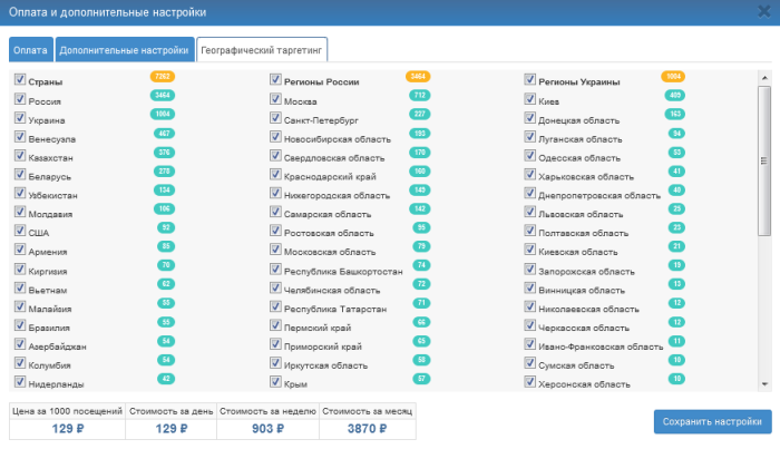 Кроме того, вы можете настроить географический таргетинг вашей рекламной кампании. Для этого укажите регионы, посетителей из которых вы хотите получать на сайт. Если вы сняли галочки с каких-либо стран и регионов, то посетители из этих областей попадать на ваш сайт не будут. Эта настройка будет полезна при продвижении сайта в конкретных регионах. Однако обратите внимание, что, поскольку все наши посетители - реальные люди, количество пользователей из отдельных регионов может быть не так велико. Поэтому, чтобы избежать резкого падения посещаемости, без крайней необходимости не указывайте слишком узкие рамки отсева по географическому расположению.