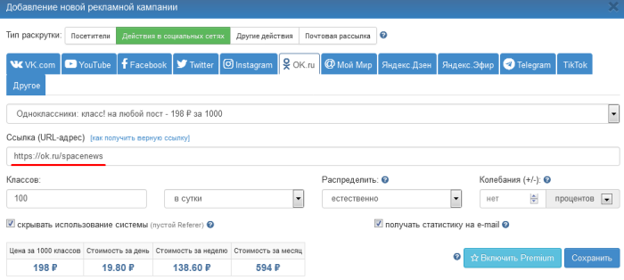 Зайдите в свой аккаунт на IPweb. В меню слева кликните «Продвижение» — «Мои кампании» — «Добавить рекламную кампанию» — «Действия в социальных сетях» — «OK» — «Одноклассники: класс! на любой пост»
