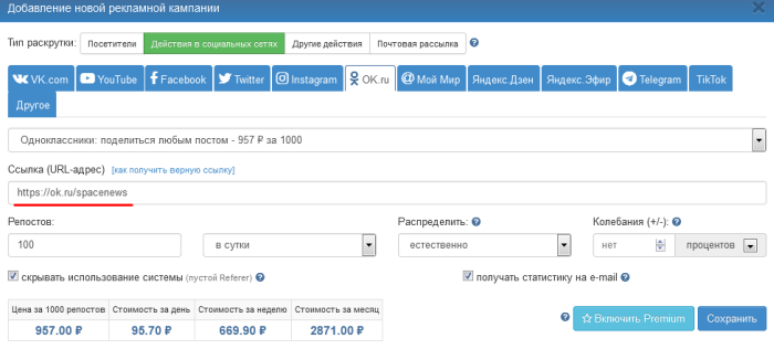 Зайдите в свой аккаунт на IPweb. В меню слева кликните «Продвижение» — «Мои кампании» — «Добавить рекламную кампанию» — «Действия в социальных сетях» — «OK» — «Одноклассники: поделиться любым постом».
