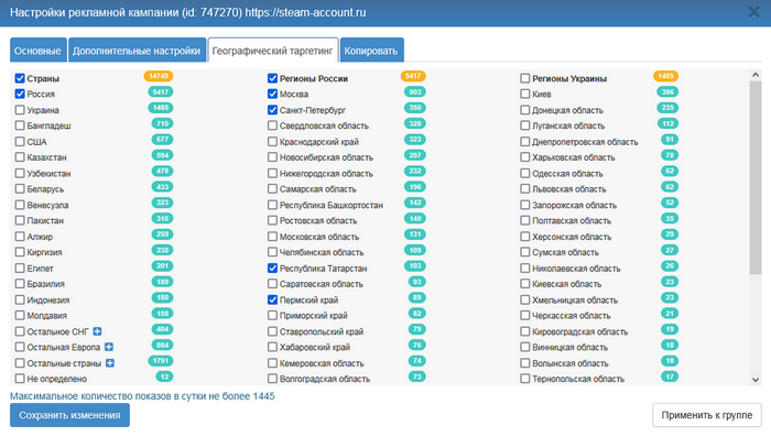 В открывшемся окне перейдите на вкладку «Географический таргетинг».