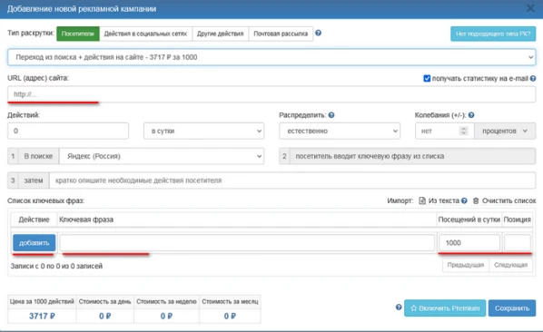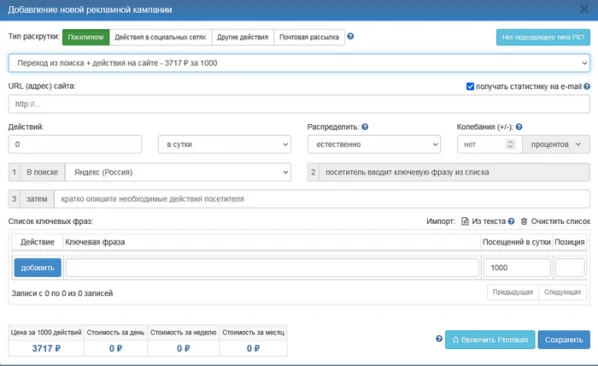 В «Типы раскрутки» выберите «Переход из поиска + действия на сайте» и заполните необходимые поля: